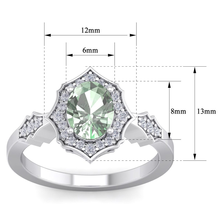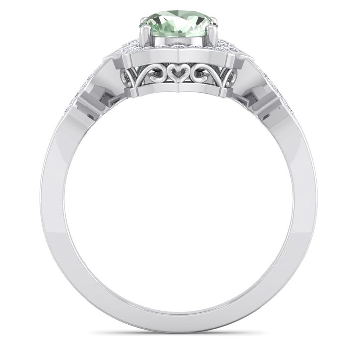 This elegant gemstone ring features one 8x6mm oval shape green amethyst gemstone at approximately 1.05 carats. It is surrounded by 26 sparkling diamonds in I-J color, I1-I2 clarity at 1/4 carat total weight. Total gem weight is approximately 1 1/3 carat total weight. This ring is in 14 karat white gold. *Retrograde Birthstones™ flips the idea of traditional birthstones. Wear your ½ birthday birthstone, your Retrograde Birthstone, “The Birthstone For Your Bad Side™.
