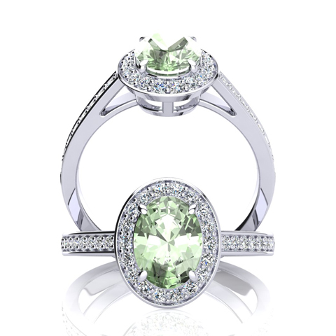 1 1/3 Carat Oval Shape Green Amethyst and Halo Diamond Ring In 14 Karat White Gold