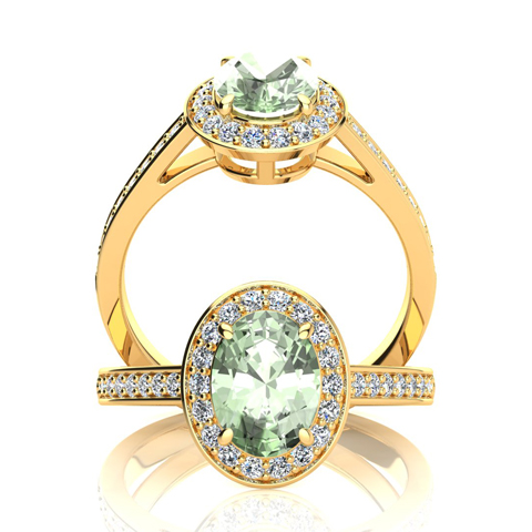 This stunning gemstone and diamond ring features one 8x6mm oval shape green amethyst gemstone at 1.05 carats. It is surrounded by 34 sparkling diamonds in a halo in I-J color, I1-I2 clarity at 0.26 carats. Total gem weight is 1.31 carats. This ring is crafted in 14 karat yellow gold.