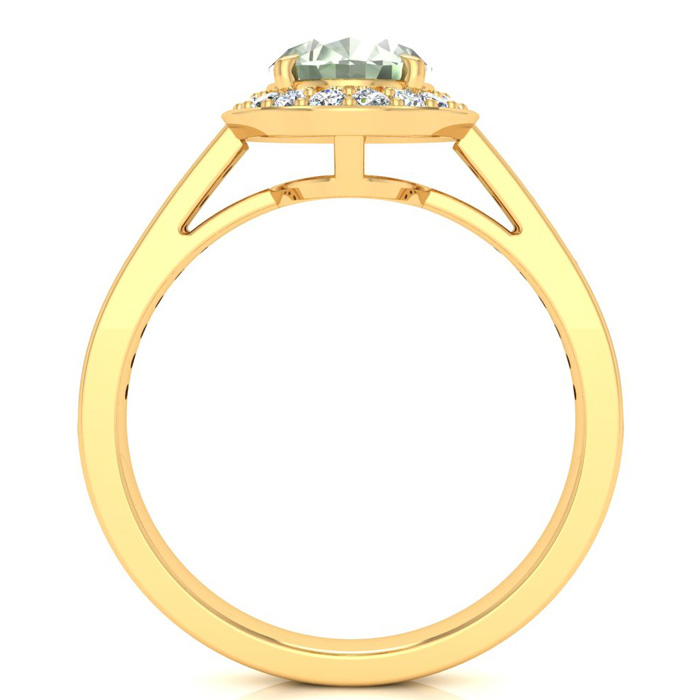 This stunning gemstone and diamond ring features one 8x6mm oval shape green amethyst gemstone at 1.05 carats. It is surrounded by 34 sparkling diamonds in a halo in I-J color, I1-I2 clarity at 0.26 carats. Total gem weight is 1.31 carats. This ring is crafted in 14 karat yellow gold.