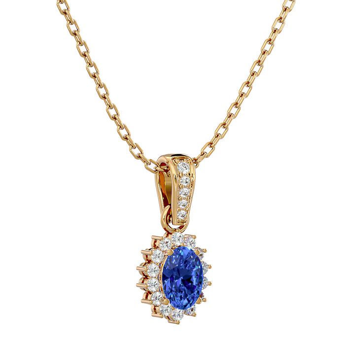 1 1/3 Carat Oval Shape Tanzanite and Diamond Necklace In 14 Karat Yellow Gold, 18 Inches