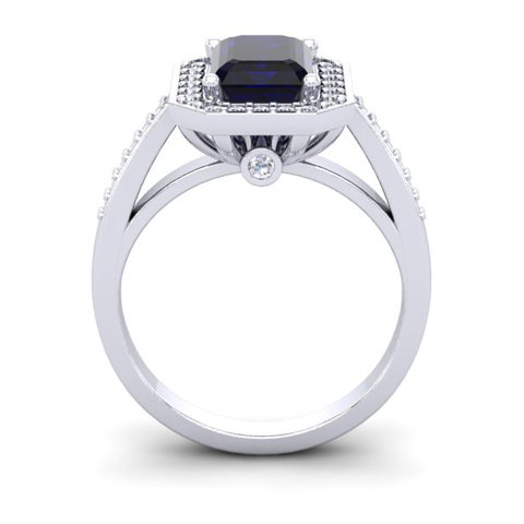 This stunning gemstone and halo diamond ring features one 7x5mm emerald shape sapphire gemstone at 1.15 carats. It is surrounded by 40 sparkling diamonds in a halo and down the band in I-J color, SI2-I1 clarity at 0.22 carats. Total gem weight is 1.36 carats. This ring is crafted in 14 karat white gold.