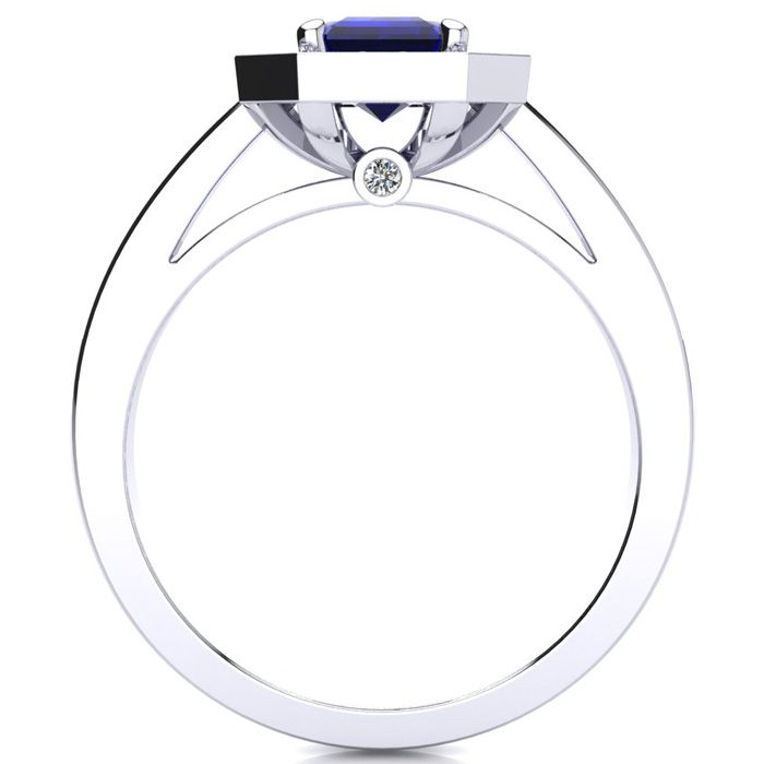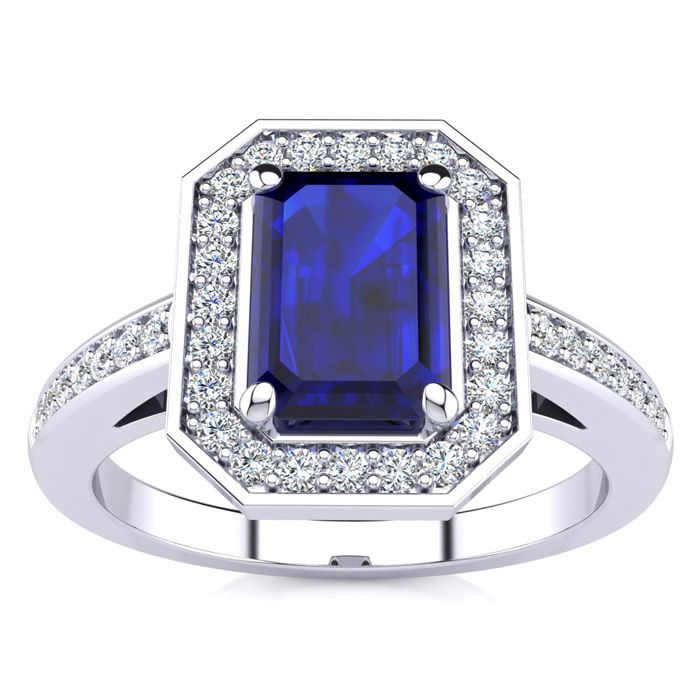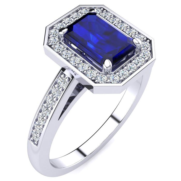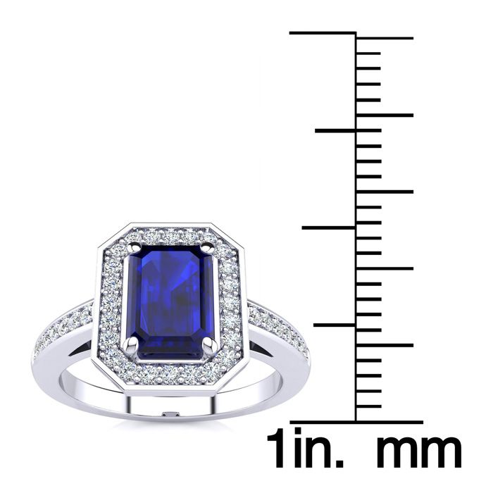 This stunning gemstone and halo diamond ring features one 7x5mm emerald shape sapphire gemstone at 1.15 carats. It is surrounded by 40 sparkling diamonds in a halo and down the band in I-J color, SI2-I1 clarity at 0.22 carats. Total gem weight is 1.36 carats. This ring is crafted in 14 karat white gold.