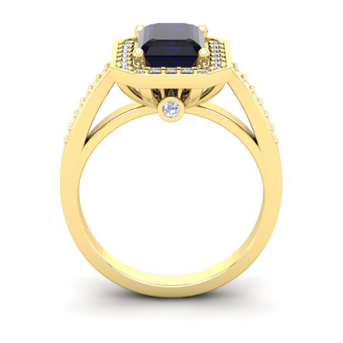 This stunning gemstone and halo diamond ring features one 7x5mm emerald shape sapphire gemstone at 1.15 carats. It is surrounded by 40 sparkling diamonds in a halo and down the band in I-J color, SI2-I1 clarity at 0.22 carats. Total gem weight is 1.36 carats. This ring is crafted in 14 karat yellow gold.