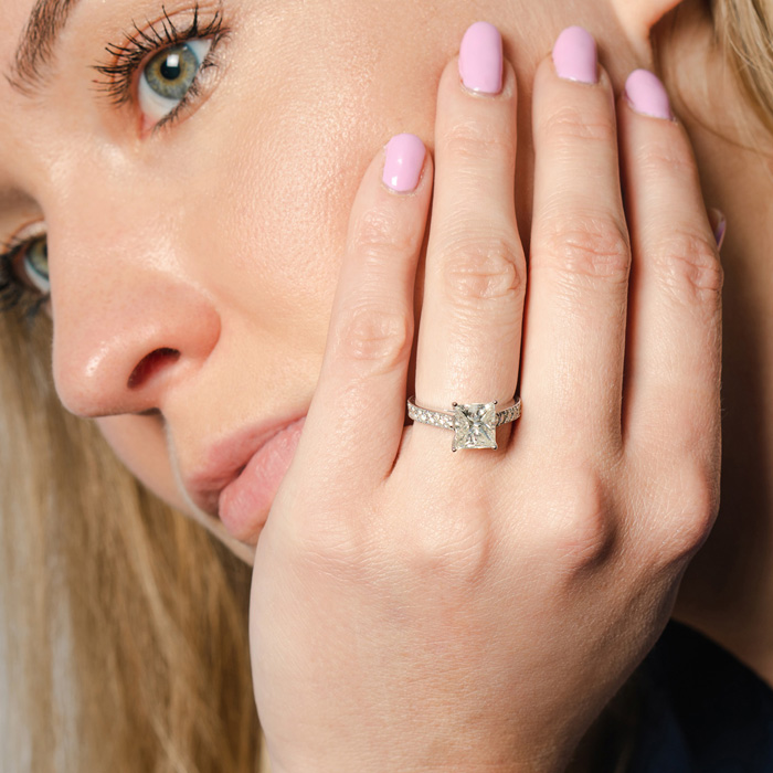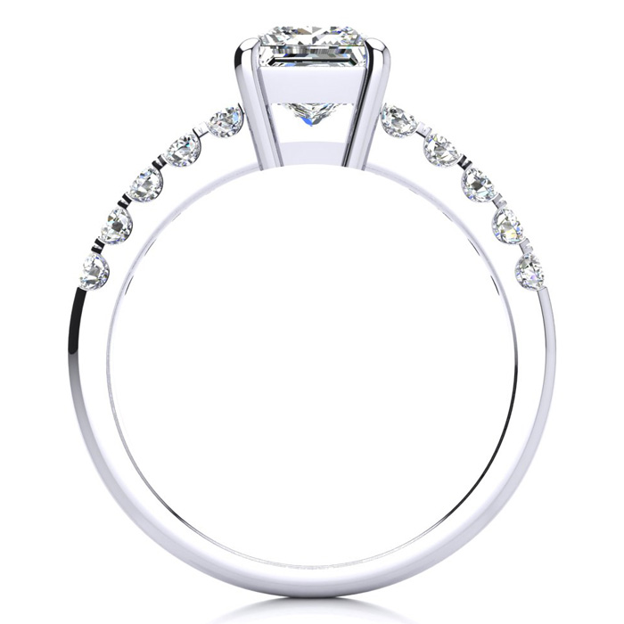 The perfect and most traditional lab grown diamond engagement ring for the lady who wants a lab grown diamond ring that is always in style. Featuring a princess cut brilliant 1 carat solitaire lab grown diamond and 10 side lab grown diamonds of 3 points each, this ring is 1.30 carats total lab grown diamond weight, set in solid 14 karat white gold. Available in ring sizes from 4 to 9.5.
