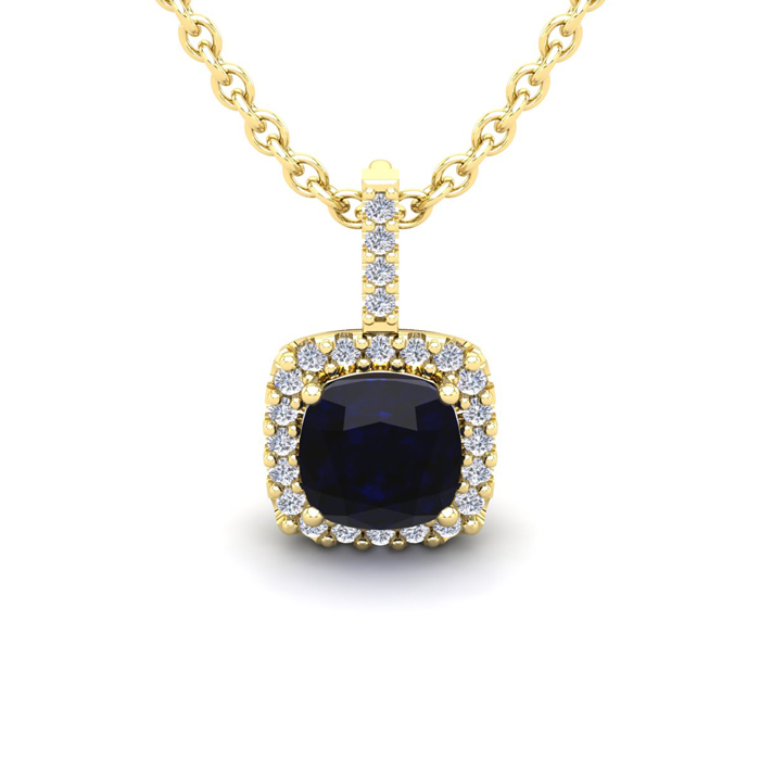 1 1/4 Carat Cushion Cut Sapphire and Halo Diamond Necklace In 14 Karat Yellow Gold, 18 Inches