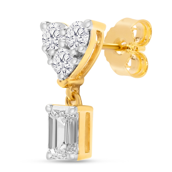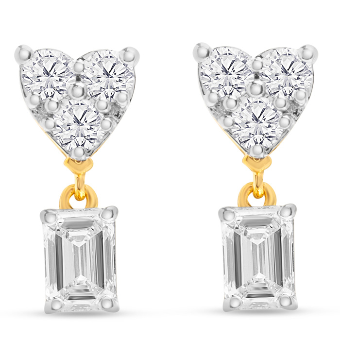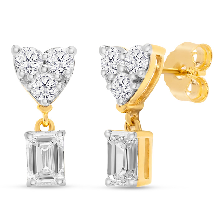 These lab grown diamond earrings feature two emerald cut lab grown diamonds and 6 round shape lab grown diamonds in a heart stud shape. Diamond color is G-H, diamond clarity is VS2. These earrings drop down 1/2 inch and have secure post with friction backs.