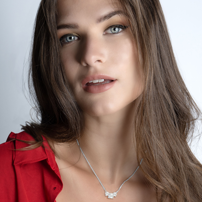 This fabulous moissanite necklace features a sparkling 3/4 carat round shape center moissanite in E-F color, VVS1-VVS2 clarity. It is surrounded by two moissanites each weighing 1/4 carat for a total weight of 1/2 carat. Total carat weight is 1 1/4 carat. This necklace is in 14 karat white gold and comes with an 18 inch cable chain with a spring-ring clasp.