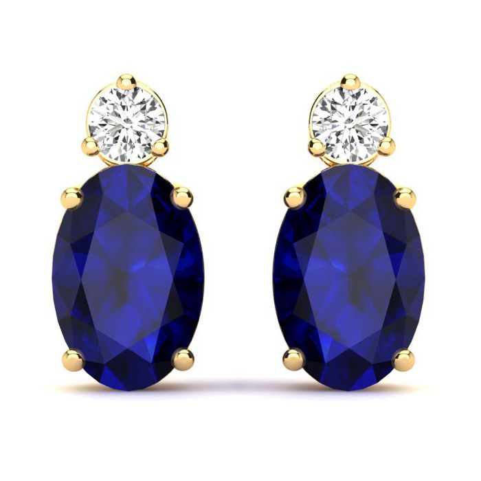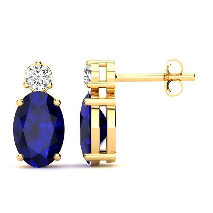 These stunning gemstone and diamond earrings feature two 6x4mm oval shape sapphire gemstones at 1.20 carats. The gemstones are accented with two sparkling diamonds in a in I-J color, SI2-I1 clarity at 0.06 carats. Total gem weight is 1.26 carats. These earrings are crafted in 14 karat yellow gold and come with comfortable and secure post with friction backs.