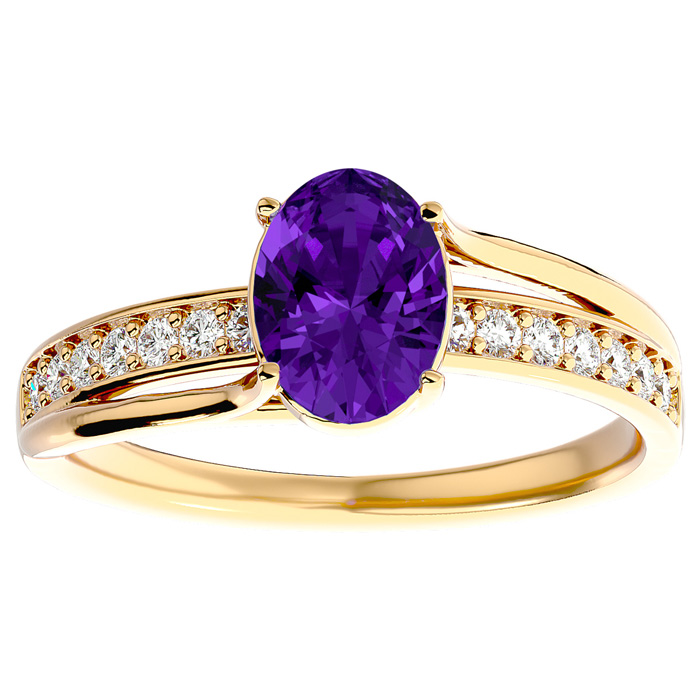 This elegant gemstone ring features one 8x6mm oval shape amethyst gemstone at approximately 1.05 carats. It is surrounded by 14 sparkling diamonds in I-J color, I1-I2 clarity at 1/5 carat total weight. Total gem weight is approximately 1 1/4 carats. This ring is in 14 karat yellow gold.
