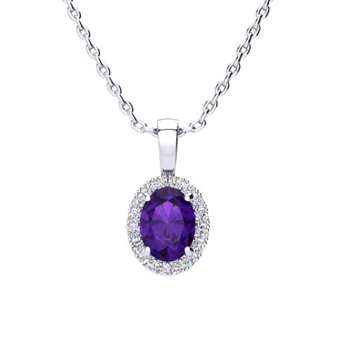 1 1/4 Carat Oval Shape Amethyst and Halo Diamond Necklace In 14 Karat White Gold With 18 Inch Chain
