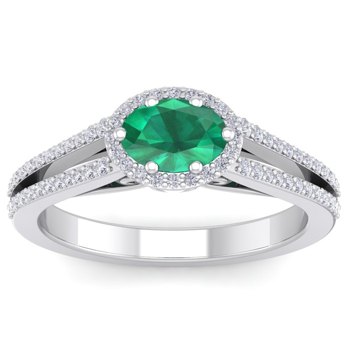 This stunning gemstone and halo diamond ring features one 7x5mm oval shape emerald gemstone at 0.80 carats. It is surrounded by 70 sparkling diamonds in a halo and down the band in H-I color, I1-I2 clarity at 0.41 carats. Total gem weight is 1.21 carats. This ring is crafted in 14 karat white gold.