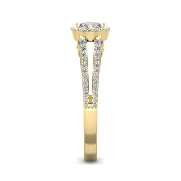 This stunning ring features one 7x5mm oval lab grown diamond at 3/4 carat. It is surrounded by 70 sparkling lab grown diamonds in a halo and down the band in G-H color, VS clarity at 1/2 carat. Total gem weight is 1 1/4 carats. This ring is crafted in 14 karat yellow gold.