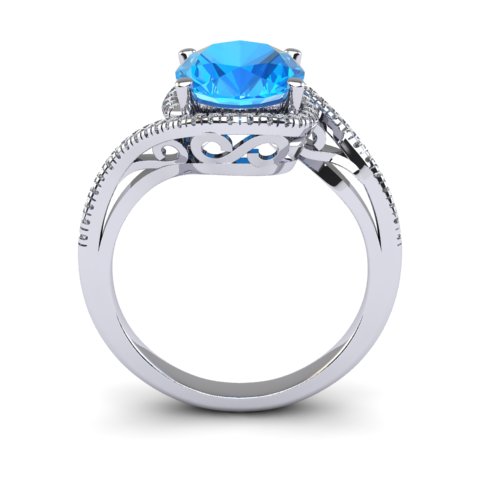 This stunning gemstone and halo diamond ring features one 7x5mm oval shape blue topaz gemstone at 1.00 carats. It is surrounded by 46 sparkling diamonds in a halo and down the band in H-I color, I1-I2 clarity at 0.23 carats. Total gem weight is 1.23 carats. This ring is crafted in 14 karat white gold.