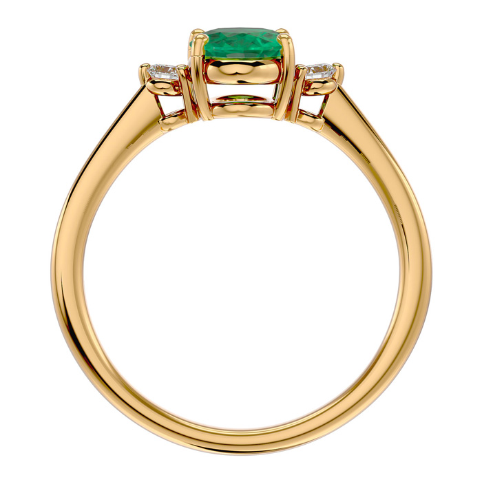 This elegant gemstone ring features one 8x6mm oval shape emerald gemstone at approximately 1.15 carats. It is surrounded by 2 sparkling diamonds in I-J color, I1-I2 clarity at 1/10 carat total weight. Total gem weight is approximately 1 1/4 carat total weight. This ring is in 14 karat yellow gold.