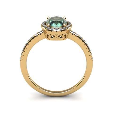 This stunning gemstone and halo diamond ring features one 8x6mm oval shape green amethyst gemstone at 1.05 carats. It is surrounded by 40 sparkling diamonds in a halo and down the band in I-J color, I1-I2 clarity at 0.20 carats. Total gem weight is 1.25 carats. This ring is crafted in 14 karat yellow gold.