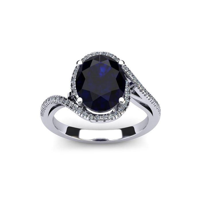 This stunning gemstone and halo diamond ring features one 7x5mm oval shape sapphire gemstone at 1.00 carats. It is surrounded by 46 sparkling diamonds in a halo and down the band in H-I color, I1-I2 clarity at 0.23 carats. Total gem weight is 1.23 carats. This ring is crafted in 14 karat white gold.