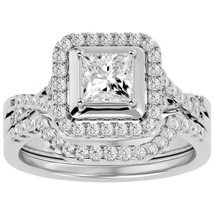 This amazing diamond bridal set features a center princess shape diamond weighing approximately 3/4 carat. It is surrounded by 63 sparkling diamonds in a halo and along the band weighing approximately 1/2 carat. Total carat weight is 1 1/4 carats. Diamond color is H-I, diamond clarity is SI2-I1. This bridal set is in 14 karat white gold.