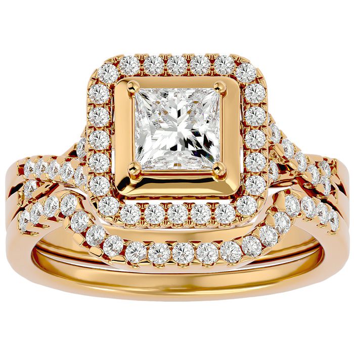 This amazing diamond bridal set features a center princess shape diamond weighing approximately 3/4 carat. It is surrounded by 63 sparkling diamonds in a halo and along the band weighing approximately 1/2 carat. Total carat weight is 1 1/4 carats. Diamond color is H-I, diamond clarity is SI2-I1. This bridal set is in 14 karat yellow gold.