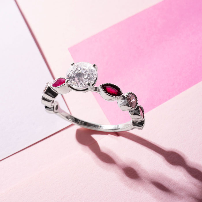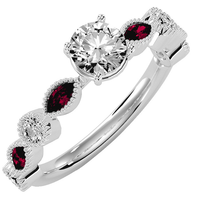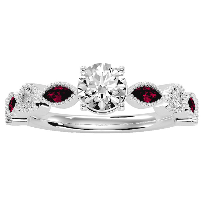 This unbelievable diamond engagement ring features a sparkling 3/4 carat clarity enhanced center diamond in I-J color, I1-I2 clarity. It is surrounded by 4 round side diamonds and 4 marquise shape ruby gemstones totaling 1/2 carat. Total carat weight is 1 1/4 carat. This ring is in 14 karat white gold.