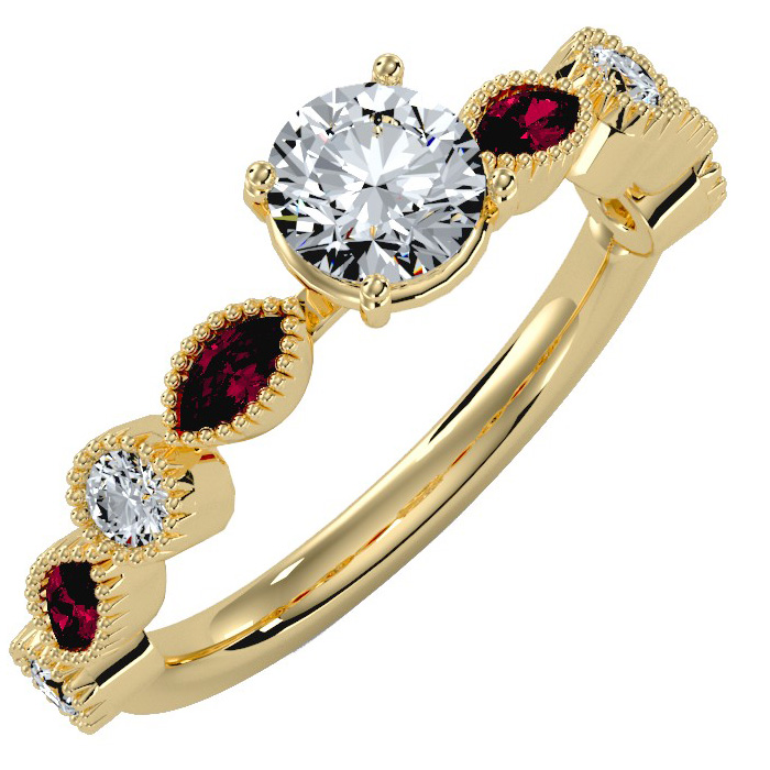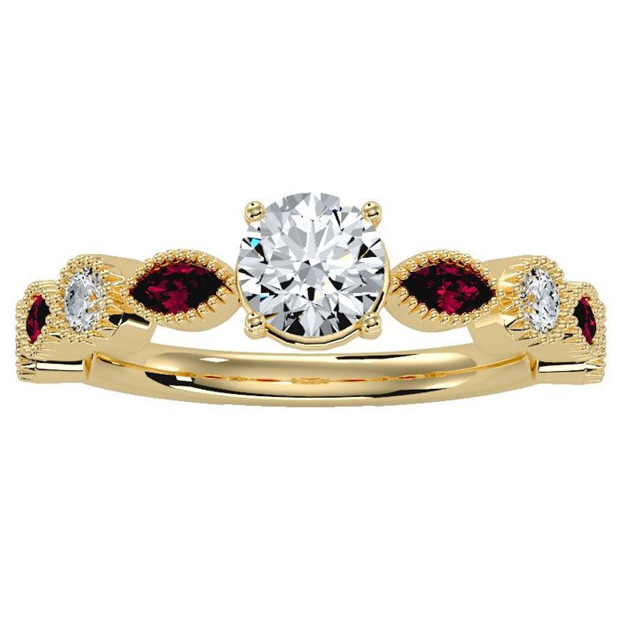 This unbelievable diamond engagement ring features a sparkling 3/4 carat center diamond in H-I color, SI2-I1 clarity. It is surrounded by 4 round side diamonds and 4 marquise shape ruby gemstones totaling 1/2 carat. Total carat weight is 1 1/4 carat. This ring is in 14 karat yellow gold.