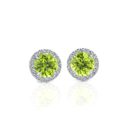 These stunning gemstone and halo diamond earrings feature two 5mm round shape peridot gemstones at 1.10 carats. The gemstones are surrounded by 40 sparkling diamonds in a halo in H-I color, I1-I2 clarity at 0.12 carats. Total gem weight is 1.22 carats. These earrings are crafted in 14 karat white gold. These earrings come with comfortable and secure post with friction backs.
