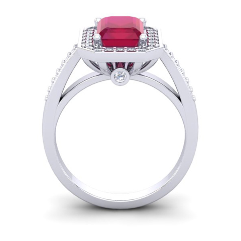 This stunning gemstone and halo diamond ring features one 7x5mm emerald shape ruby gemstone at 1.00 carats. It is surrounded by 40 sparkling diamonds in a halo and down the band in I-J color, SI2-I1 clarity at 0.22 carats. Total gem weight is 1.21 carats. This ring is crafted in 14 karat white gold.