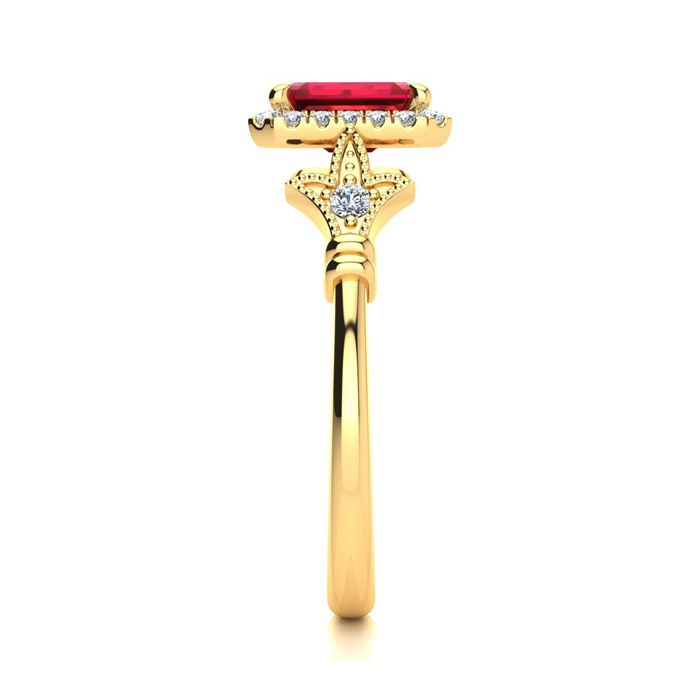 This stunning gemstone and halo diamond vintage ring features one 7x5mm emerald cut ruby gemstone at 1.00 carats. It is surrounded by 22 sparkling diamonds in a halo and down the band in H-I color, I1-I2 clarity at 0.25 carats. Total gem weight is 1.25 carats. This ring is crafted in 14 karat yellow gold. *Retrograde Birthstones™ flips the idea of traditional birthstones. Wear your ½ birthday birthstone, your Retrograde Birthstone, “The Birthstone For Your Bad Side™.