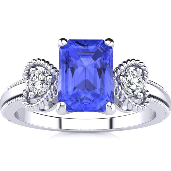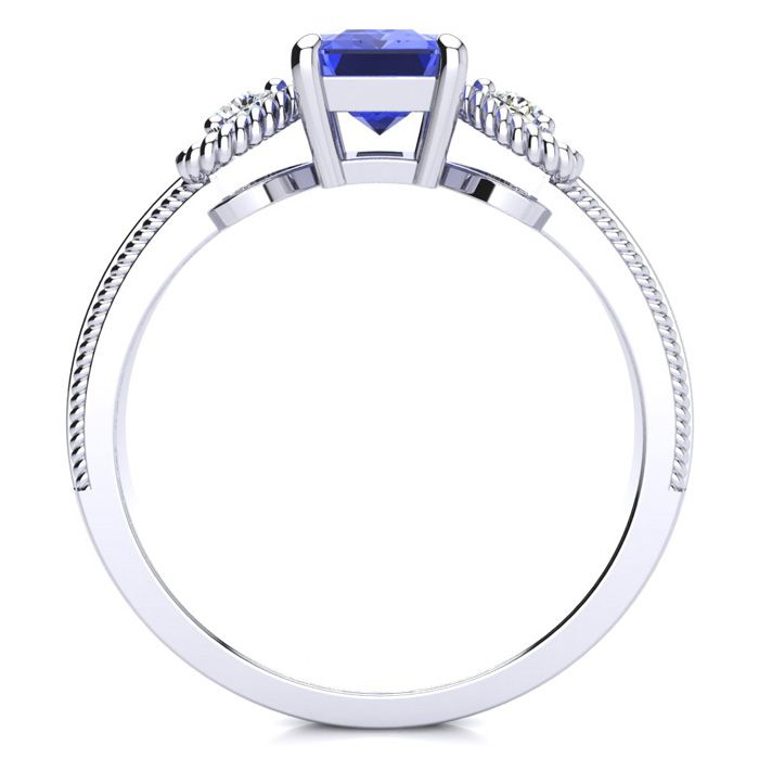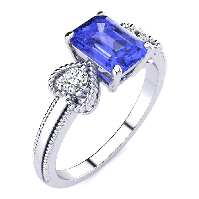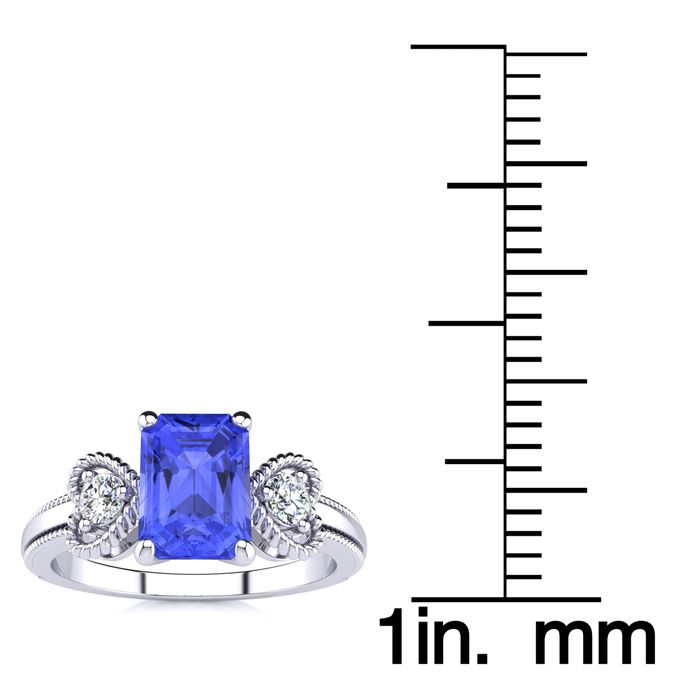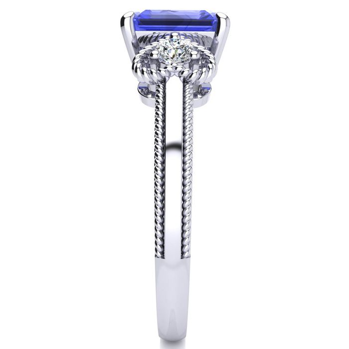 This stunning gemstone and diamond ring features one 7x5mm emerald cut tanzanite gemstone at 1.15 carats. It is surrounded by 2 sparkling diamonds in a heart in I-J color, I1-I2 clarity at 0.12 carats. Total gem weight is 1.27 carats. This ring is crafted in 10 karat white gold.