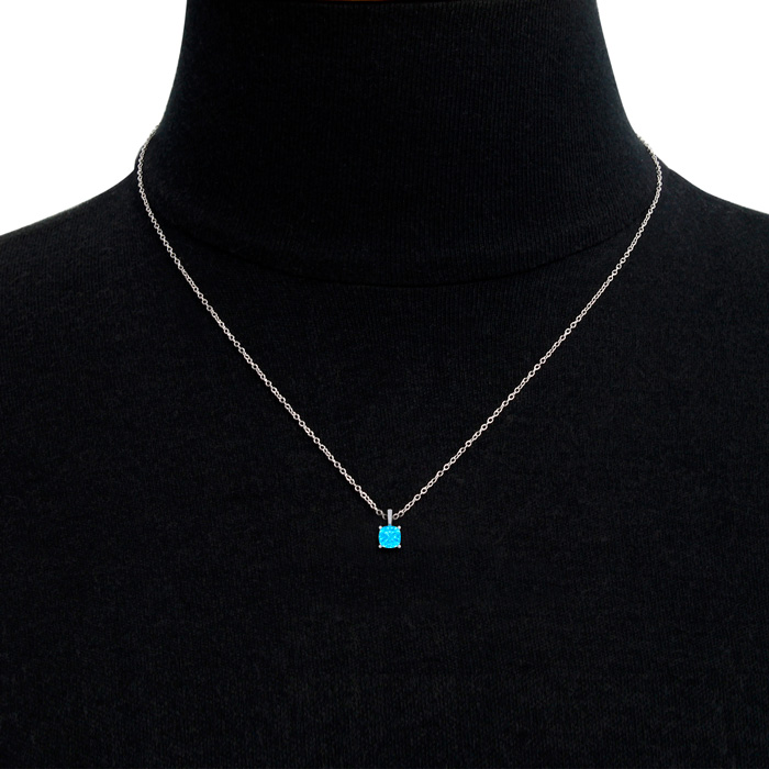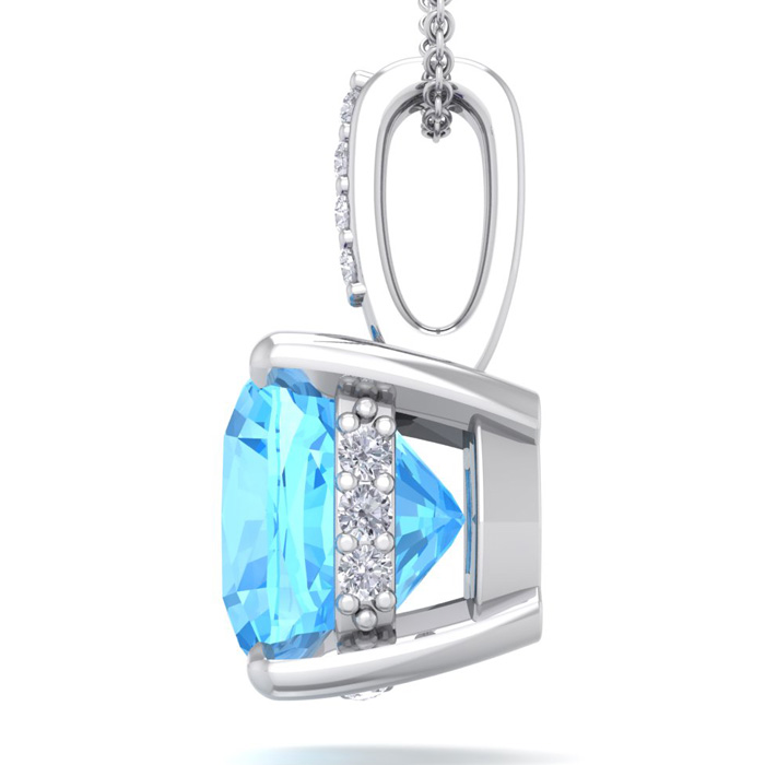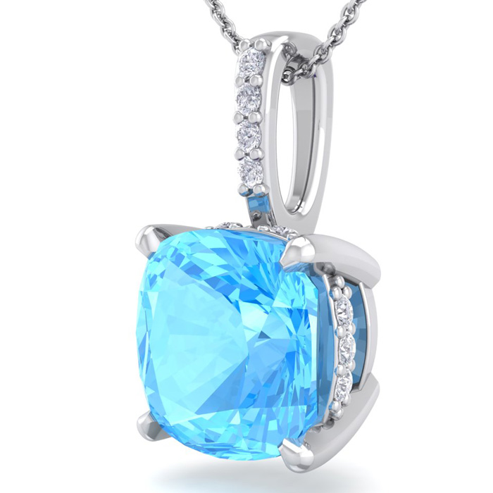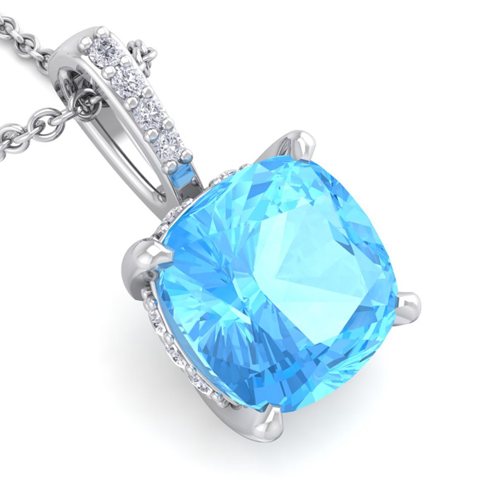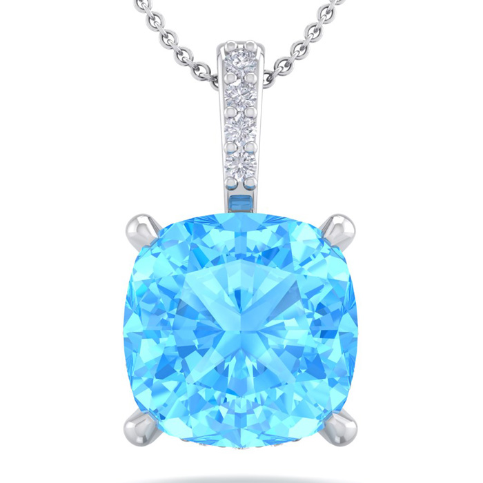 This elegant gemstone and diamond necklace features one 6mm cushion cut blue topaz gemstone at approximately 1.15 carats. It is accented with 15 sparkling diamonds in I-J color, I1-I2 clarity at 0.04 carats total. Total gem weight is approximately 1 1/5 carats. This necklace is in 14 karat white gold. This necklace comes with an 18 inch cable chain with a spring-ring clasp.