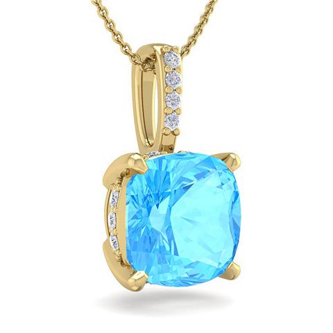 This elegant gemstone and diamond necklace features one 6mm cushion cut blue topaz gemstone at approximately 1.15 carats. It is accented with 15 sparkling diamonds in I-J color, I1-I2 clarity at 0.04 carats total. Total gem weight is approximately 1 1/5 carats. This necklace is in 14 karat yellow gold. This necklace comes with an 18 inch cable chain with a spring-ring clasp.