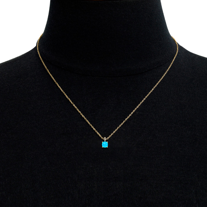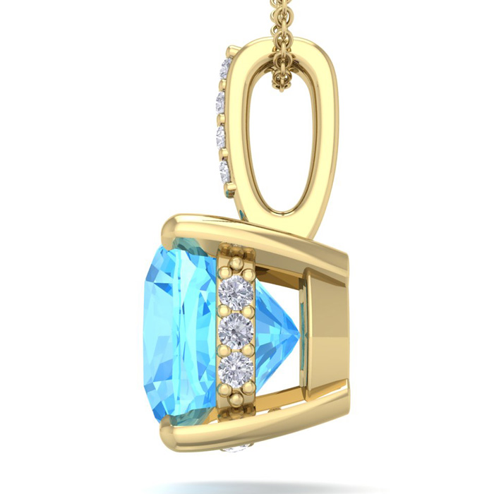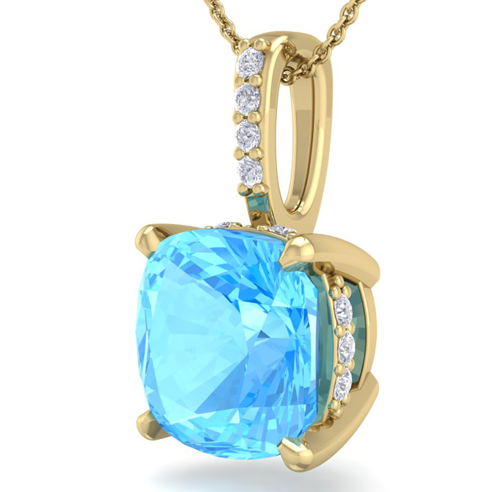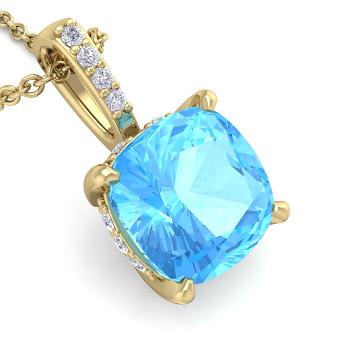 This elegant gemstone and diamond necklace features one 6mm cushion cut blue topaz gemstone at approximately 1.15 carats. It is accented with 15 sparkling diamonds in I-J color, I1-I2 clarity at 0.04 carats total. Total gem weight is approximately 1 1/5 carats. This necklace is in 14 karat yellow gold. This necklace comes with an 18 inch cable chain with a spring-ring clasp.