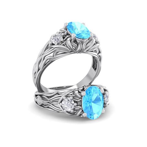 1 1/4 Carat Oval Shape Blue Topaz and Diamond Intricate Vine Engagement Ring In 14 Karat White Gold