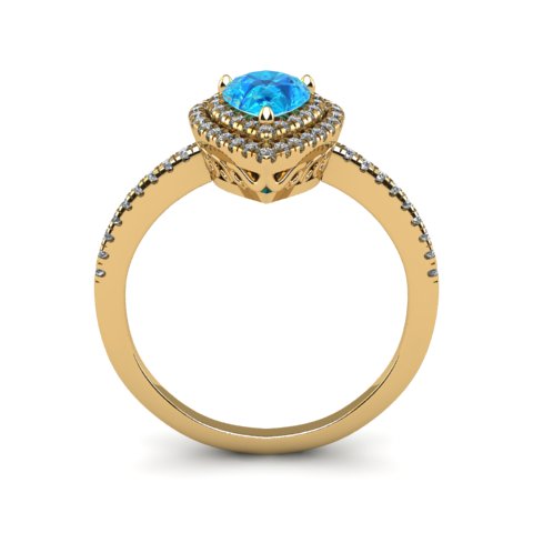 1 1/5 Carat Pear Shape Blue Topaz and Double Halo Diamond Ring In 14 Karat Yellow Gold