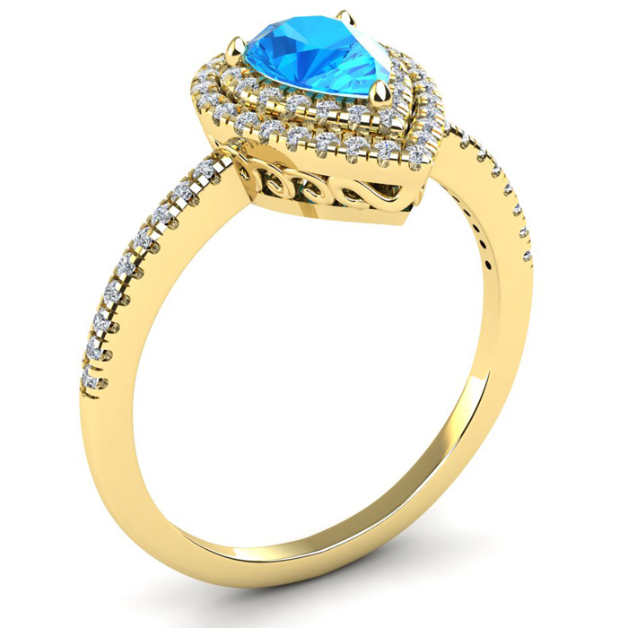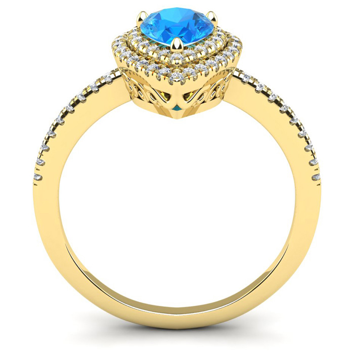1 1/5 Carat Pear Shape Blue Topaz and Double Halo Diamond Ring In 14 Karat Yellow Gold