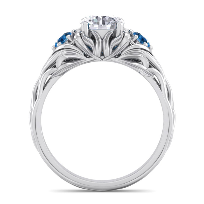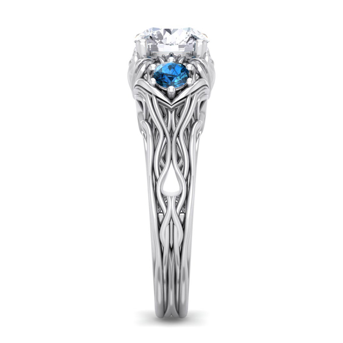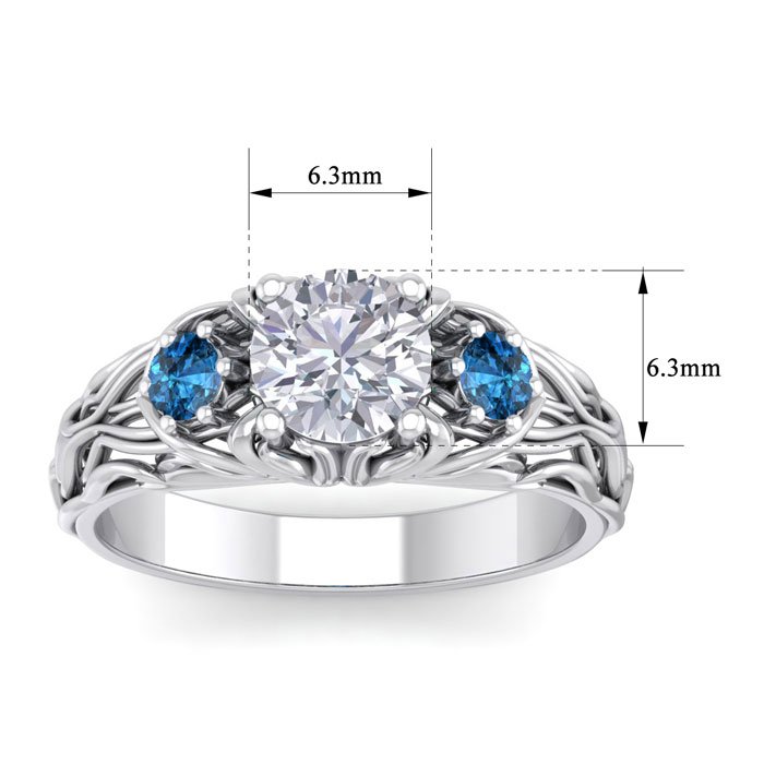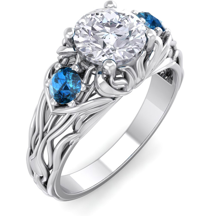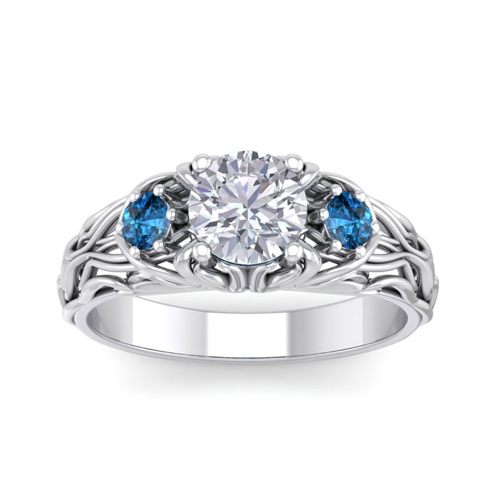 1 1/4 Carat Round Shape Diamond and Blue Diamond Vine Engagement Ring In 14 Karat White Gold