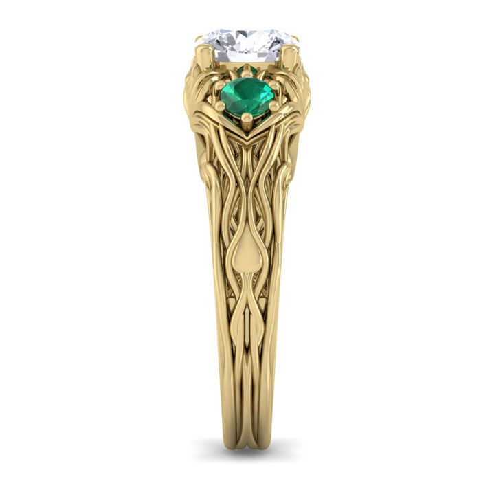 1 1/4 Carat Natural Round Shape Diamond and Emerald Vine Engagement Ring In 14 Karat Yellow Gold