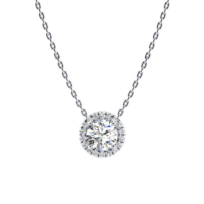 Show her that she is the center of your universe by giving her this beautiful lab grown diamond halo necklace featuring a round brilliant 1 carat center lab grown diamond surrounded by 18 fiery accent diamonds. Lab grown diamond color is G-H, clarity is VS.