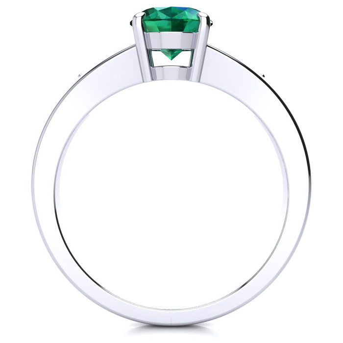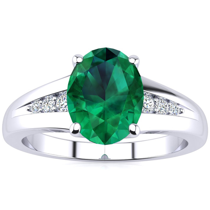 This classic gemstone ring features one 8x6mm oval shape emerald gemstone at approximately 1.15 carats. It is surrounded by 6 sparkling diamonds in I-J color, I1-I2 clarity at 0.06 carats. Total gem weight is approximately 1.21 carats. This ring is in 10 karat white gold.