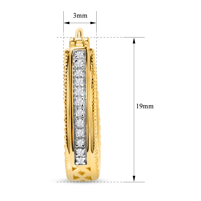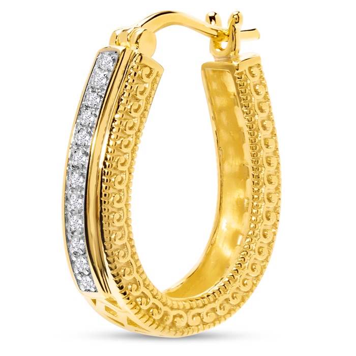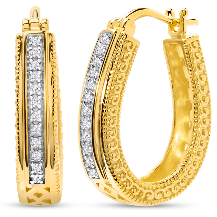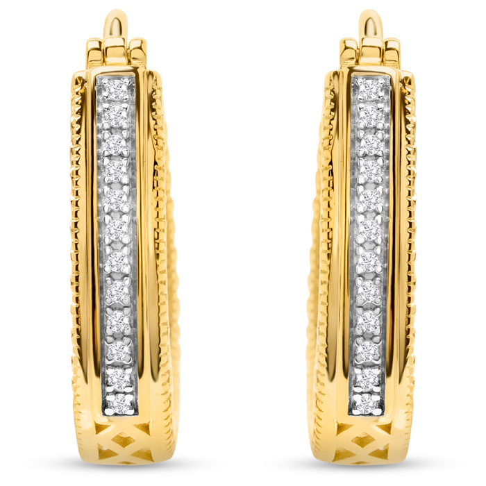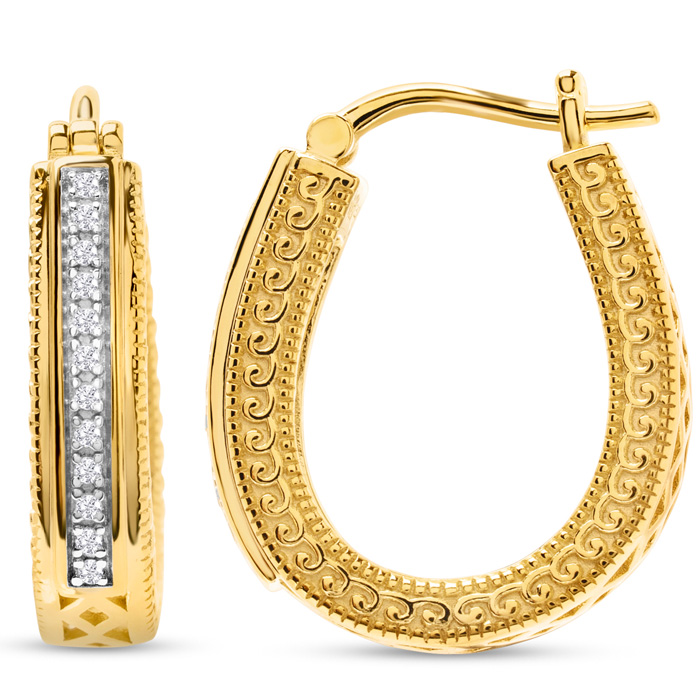 These diamond hoop earrings feature 24 sparkling diamonds in J-K color, I2-I3 clarity totaling 1/10 carat. These earrings are 3/4 inch in diameter and have hinge with notched posts. These earrings are in 14k yellow gold over sterling silver.