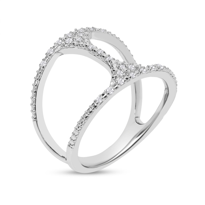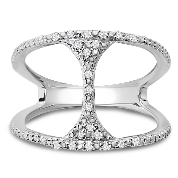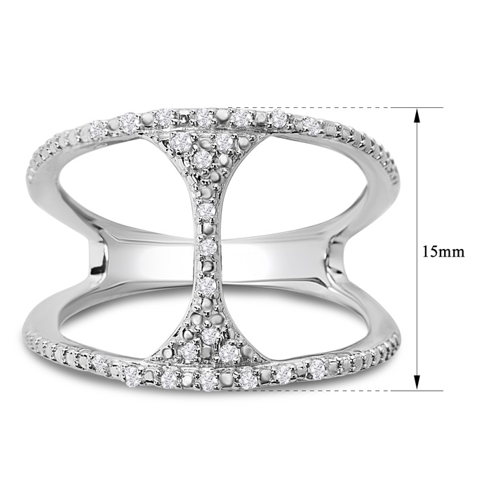 This amazing diamond ring features 20 sparkling diamonds in H-I color, I2-I3 clarity weighing 1/10 carat. The widest part of the ring is 15mm. This ring is in sterling silver.