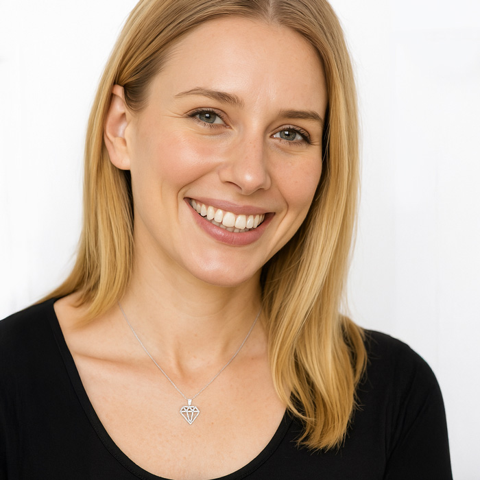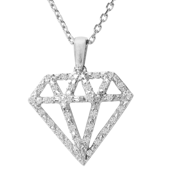 This diamond necklace features 32 sparkling diamonds in G-H color, SI1-SI2 clarity adorning a diamond shape! Total carat weight is 1/10 carat. This necklace measures 1/2 inch and comes with an 18 inch cable chain with a spring-ring clasp.