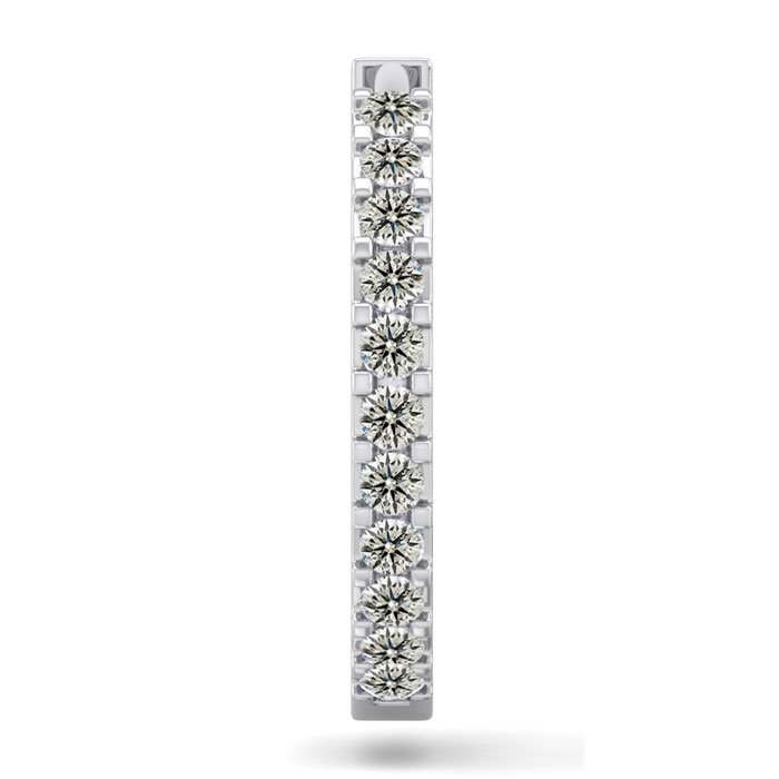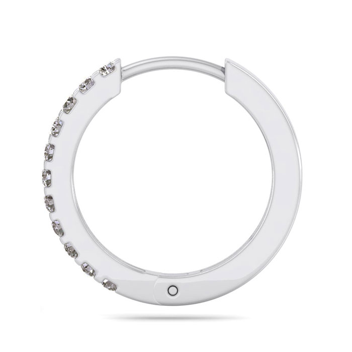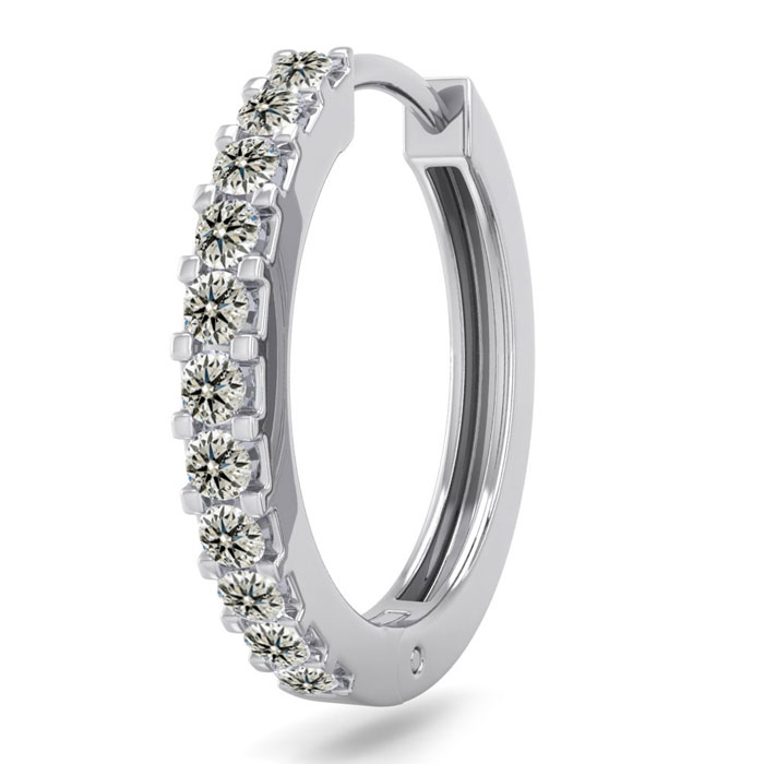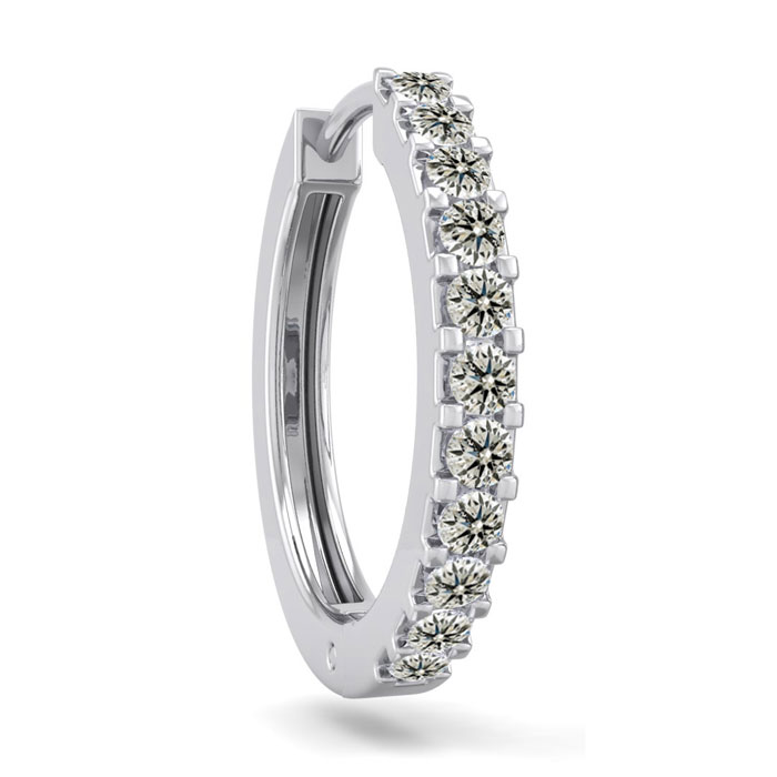 This elegant mens diamond hoop earring features 11 diamonds totaling 1/10 carat. Diamond color is K-L color, I2-I3 clarity. This earring is in 14 karat white gold and has comfortable and secure hidden snap backs.