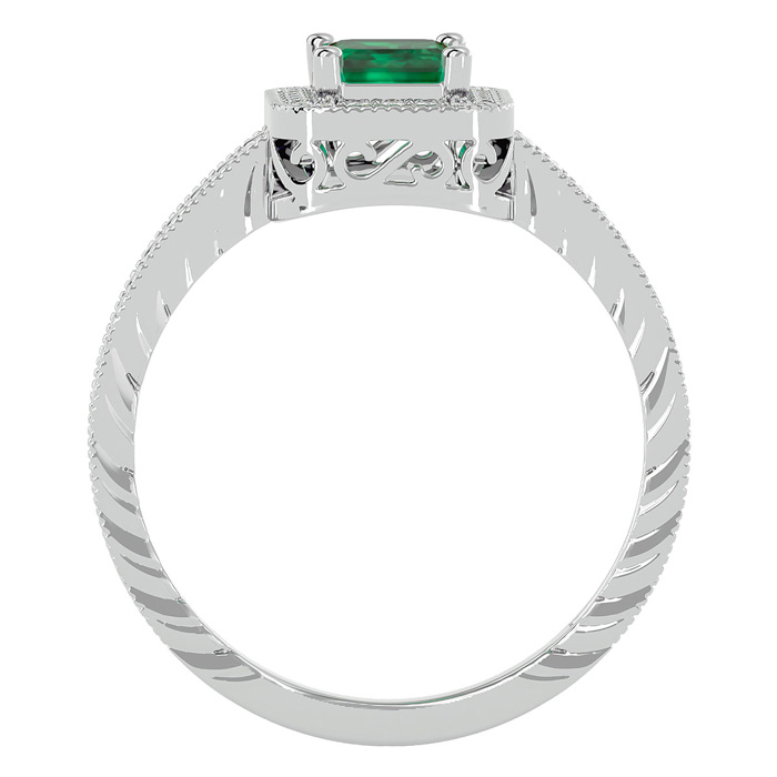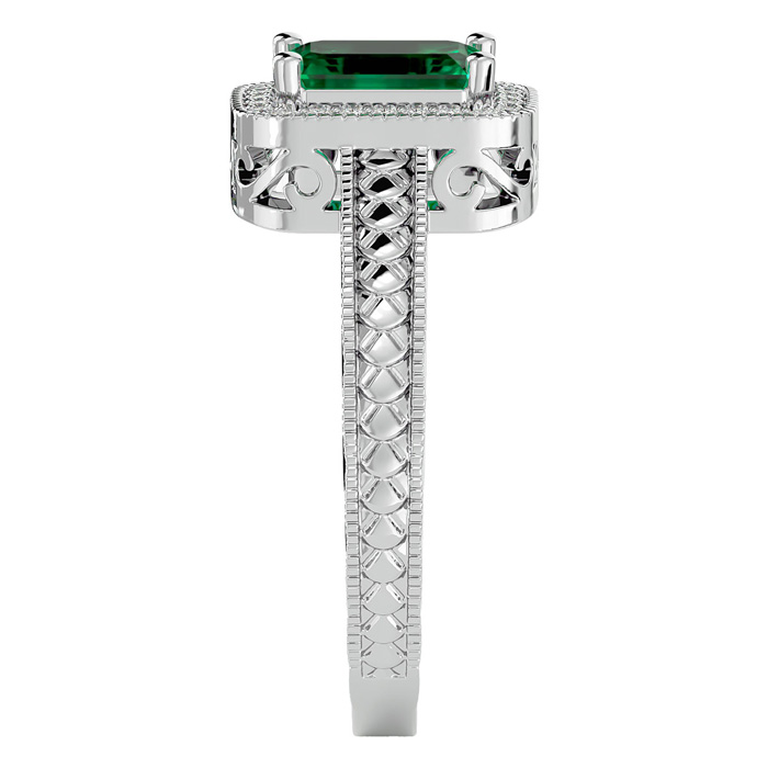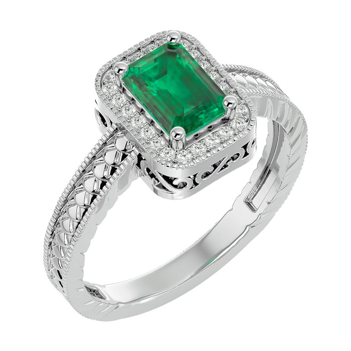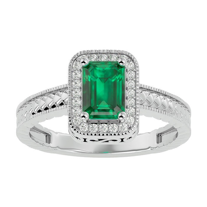 This antique style gemstone ring features a 7x5mm emerald cut emerald gemstone weighing approximately 1 carat. There are 24 side diamonds in I-J color, I1-I2 clarity totaling approximately 0.12 carats. Total carat weight is approximately 1.12 carats. This ring is in 14 karat white gold.