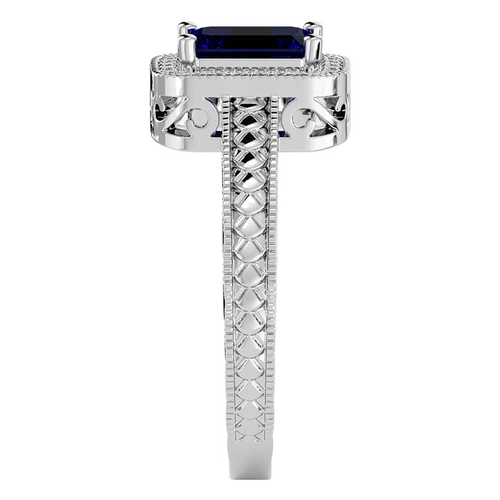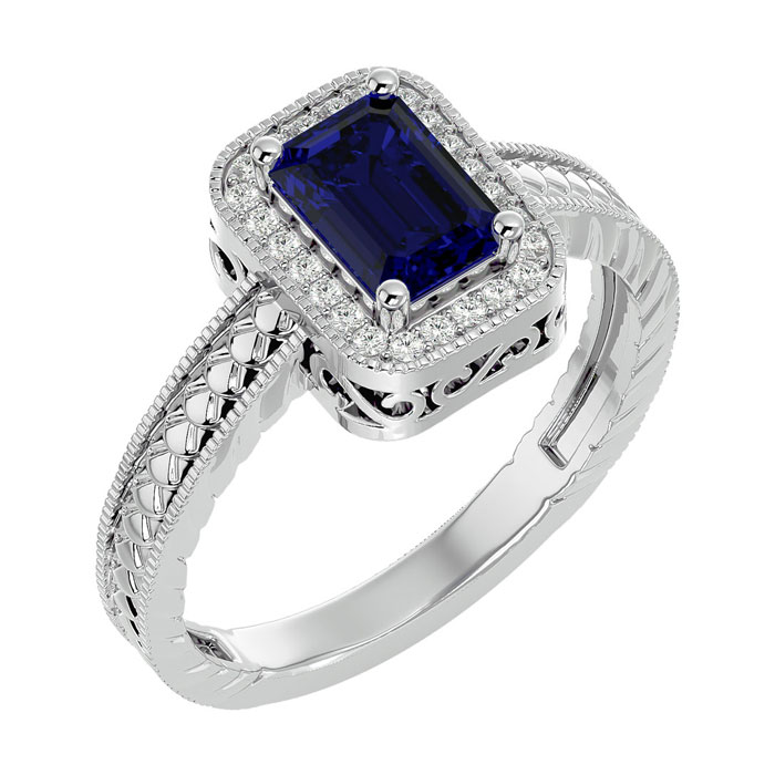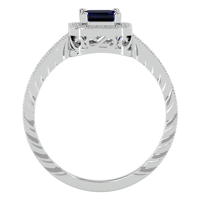 This antique style gemstone ring features a 7x5mm emerald cut sapphire gemstone weighing approximately 1 carat. There are 24 side diamonds in I-J color, I1-I2 clarity totaling approximately 0.12 carats. Total carat weight is approximately 1.12 carats. This ring is in 14 karat white gold.
