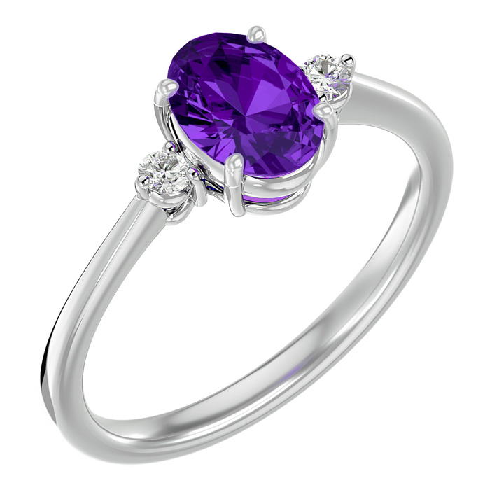 This elegant gemstone ring features one 8x6mm oval shape amethyst gemstone at approximately 1.05 carats. It is surrounded by 2 sparkling diamonds in I-J color, I1-I2 clarity at 1/10 carat total weight. Total gem weight is approximately 1.15 carat total weight. This ring is in 14 karat white gold.