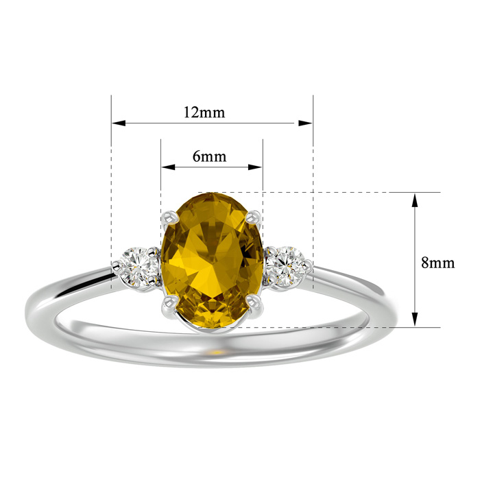 This elegant gemstone ring features one 8x6mm oval shape citrine gemstone at approximately 1.05 carats. It is surrounded by 2 sparkling diamonds in I-J color, I1-I2 clarity at 1/10 carat total weight. Total gem weight is approximately 1.15 carat total weight. This ring is in 14 karat white gold.