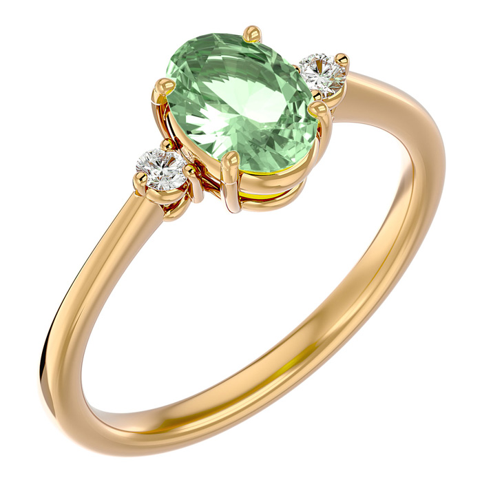 1.15 Carat Oval Shape Green Amethyst and Two Diamond Ring In 14 Karat Yellow Gold
