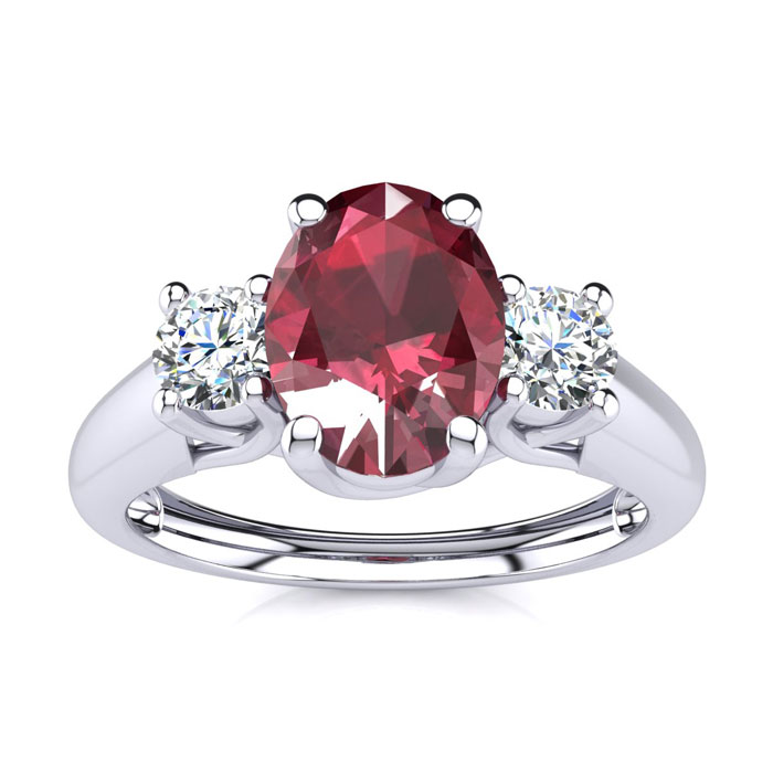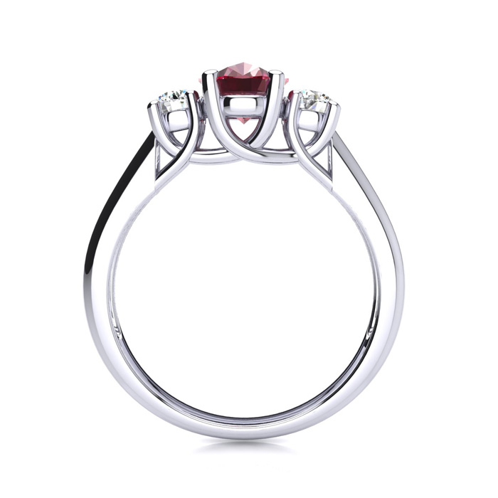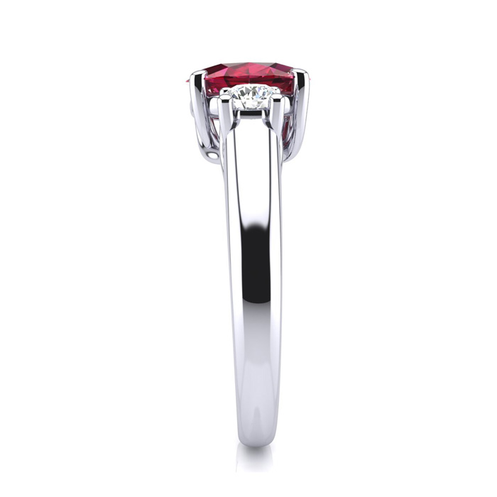 This stunning gemstone and diamond ring features one 7x5mm oval shape ruby gemstone at 1.00 carats. It is surrounded by 2 sparkling diamonds in J-K color, I2 clarity at 0.20 carats. Total gem weight is 1.15 carats. This ring is crafted in solid 925 Sterling Silver