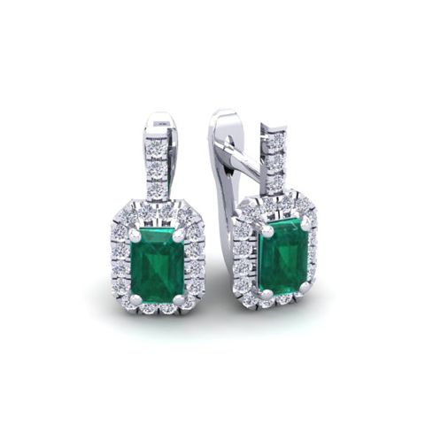 These stunning gemstone and halo diamond earrings feature two 6x4mm emerald cut created emerald gemstones at 1.20 carats. The gemstones are surrounded by 38 sparkling diamonds in a halo in I-J color, SI2-I1 clarity at 0.48 carats. Total gem weight is 1.68 carats. These earrings are crafted in 14 karat white gold and come with comfortable and secure snap backs.